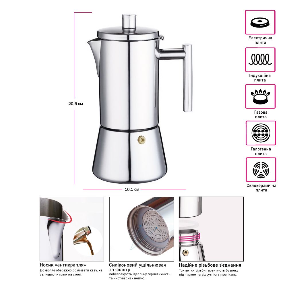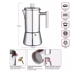 Підходить для всіх різновидів плит, включаючи індукційні. Об’єм: 200 мл. Діаметр: 95 мм. Розмір: 205×101 мм. Розмір упаковки: 210×110×130 мм. Вага: 800 г. Вишуканий подарунковий бокс можна укомплектовати меленою кавою, цукерками або фірмовим брендованим горнятком для кави.
