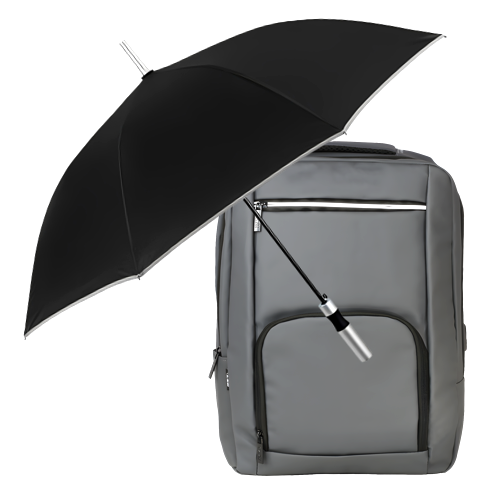 Зонтик-трость со светоотражающим кантом. Диаметр купола – 103 см, конструкция – антивитер. Светоотражающий кант по краю купола повышает безопасность в темное время суток. Прямая пластиковая ручка матового серебристого цвета с кнопкой для автоматического открывания. Длина – 83 см.