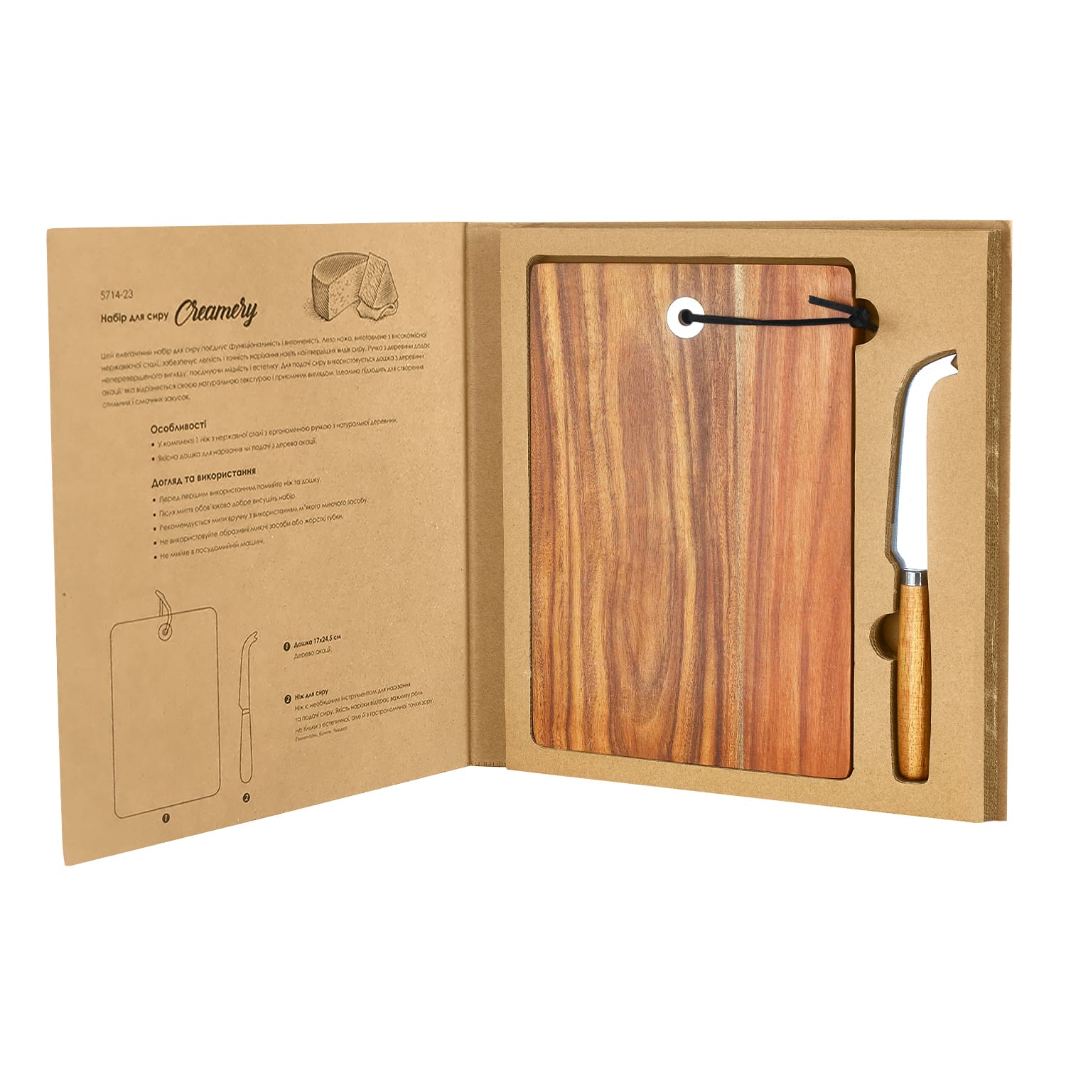 Розмір дошки - 24,5 x 17 x 11,5 см. Розмір ножа - 22,3 см.