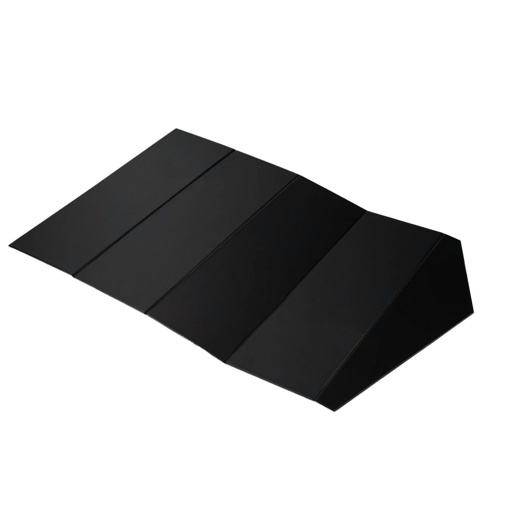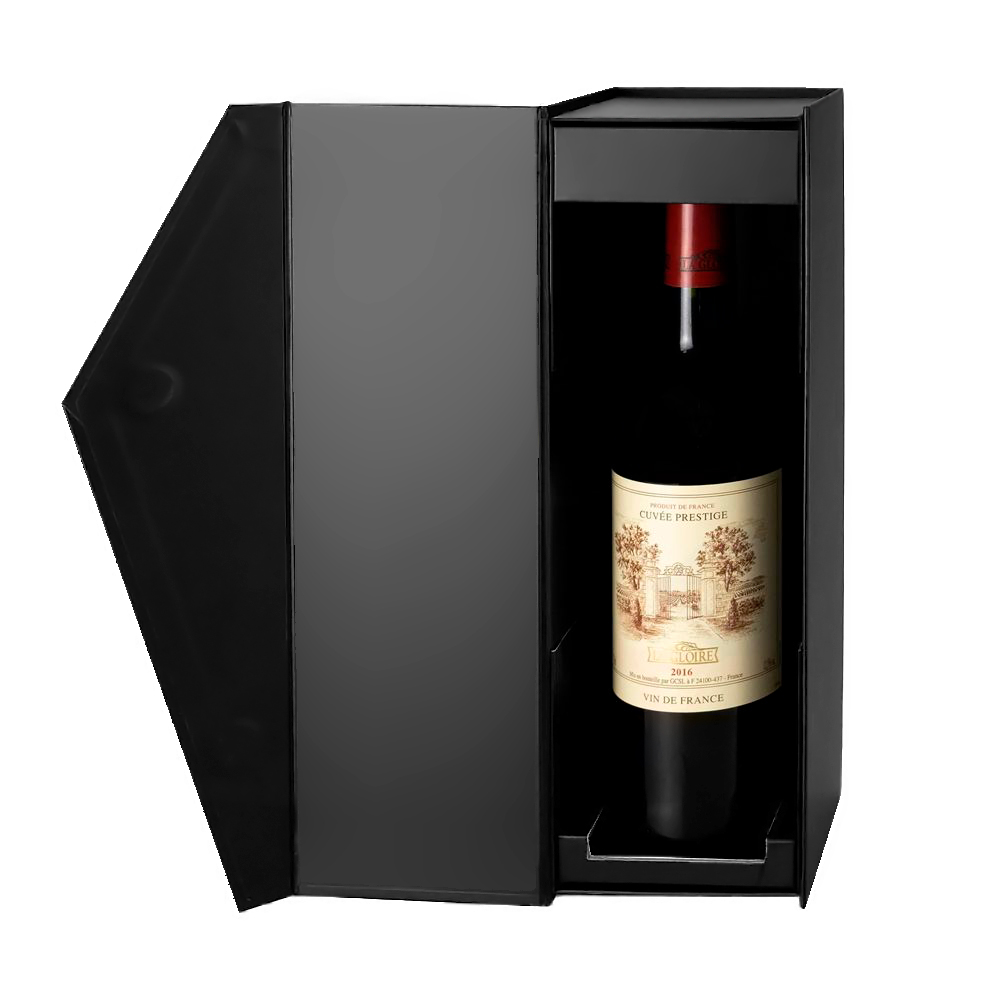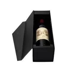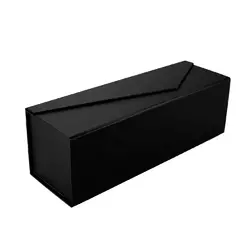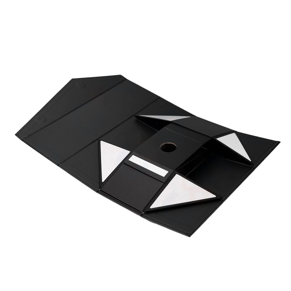 Виготовлена з міцного картону щільністю 1200 г/м², покритого крейдованим папером (157 г/м² C2S) з матовою ламінацією, що надає коробці витонченого вигляду та захисту від подряпин. Має складану конструкцію (Collapsible Wine Box) з кутовим склеюванням (corner glued), що забезпечує надійність і зручність у використанні. Особливий акцент – оригінальна форма кришки з трикутним зрізом, що додає коробці сучасного та елегантного вигляду. Коробка щільно закривається за рахунок магнітів. Нанесення логотипа на коробку - послуга, яка зробить логотип вашого бренду зіркою подарунка.