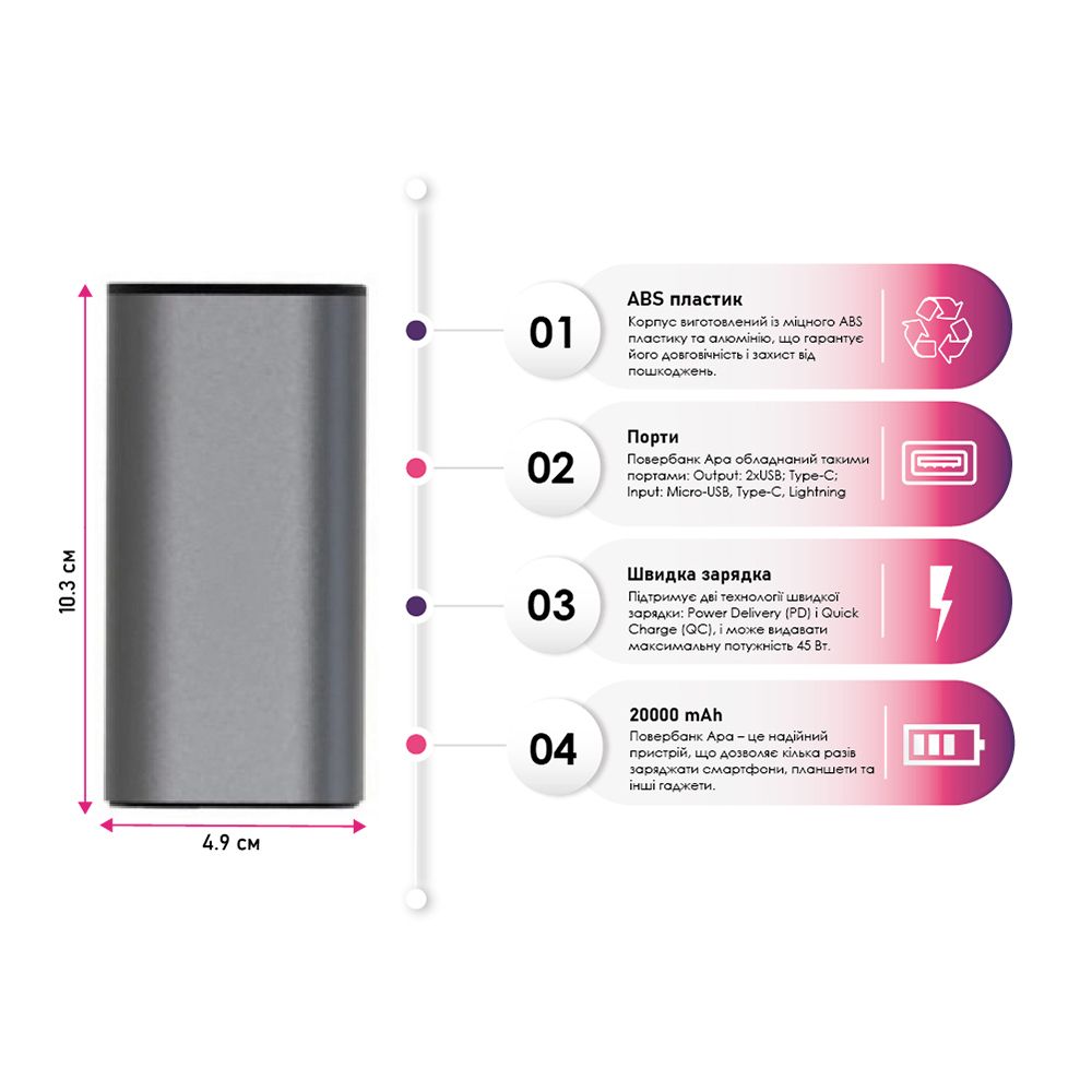 Павербанк підтримує швидку зарядку через порти Type-C, Micro USB та Lightning, що робить його сумісним із широким спектром пристроїв. Корпус виготовлений із міцного ABS пластику та алюмінію, що гарантує його довговічність і захист від пошкоджень.