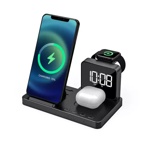 Беспроводное зарядное устройство* - Эта новейшая технологичная разработка изменила опыт пользования электроникой, расширив рамки удобства и сдвинув устаревшие стандарты. Такое решение позволяет забыть о проблемах запутанных проводов и оптимизировать пространство, сделав беспроводное зарядное устройство стильным и функциональным элементом интерьера. Модель CONVEE дает возможность одновременной подзарядки до трех устройств. Производителем предусмотрены два элемента для зарядки беспроводных наушников и смартчасов. Благодаря оптимально подобранному углу наклона устройство позволяет использовать подставку во время воспроизведения медиа на телефоне. Цифровые часы с функцией будильника питаются от литиевой батареи. Часы имеют встроенный LED-экран с возможностью отображения времени в форматах 12/24 часов, 5 уровней регулировки яркости и кнопку отложенного сигнала. Интеллектуальная система автоматически регулирует выходную мощность в соответствии с необходимыми параметрами заряжаемого гаджета.