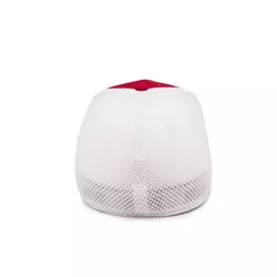 Двухцветная кепка имеет шесть клиньев с люверсами, украшенными вышивкой. Передние структурированные панели изготовлены из плотного хлопка, боковые и задние – из сетчатого полиэстра (mesh). Такое решение обеспечивает лучшую воздухопроницаемость и вентиляцию.