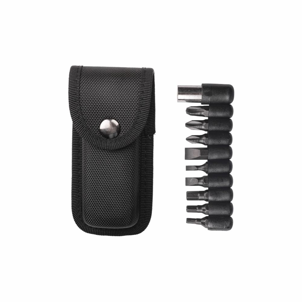 Под одним корпусом собраны: плоскогубцы-кусачки, открывалка для бутылок, консервный нож, отвертка SL, держатель для бит, также добавляется набор отверточных бит (9 шт.).