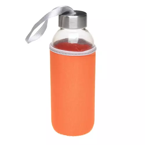 Стеклянная бутылка в защитном чехле из SBR. Крышка из нержавеющей стали и ремешок для переноски.