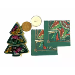 Изысканный подарочный набор для праздничного стола. Мы положили в бокс вещи, любая из которых сама по себе способна сделать праздничное настроение. Ранер – дорожка с дизайнерским рождественским принтом, монашествующая в форме елки на бамбуковой подносе, ароматическая свеча из соевого воска, конфеты из швейцарского шоколада с начинкой пралине.