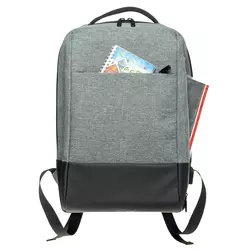 Двухцветный рюкзак для ноутбука 14". Имеет основное отделение с карманами-органайзерами. Наружный отдел на вертикальной светоотражающей молнии, вместительный передний карман. Сбоку рюкзака есть встроенный USB-порт с кабелем внутри для удобной зарядки гаджетов. На спинке есть крепление на ручку чемодана. Мягкие регулируемые наплечные лямки. Материал: Полиэстер 300D.