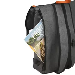 Рюкзак имеет продуманную конструкцию: большое отделение с мягким карманом для ноутбука до 15", дополнительные внутренние карманы для мелких вещей и аксессуаров, а также вместительный передний карман на молнии. Верхняя панель рюкзака откидывается вниз и фиксируется ремешками с застежками. На ней расположен дополнительный карман на молнии, а сбоку предусмотрен отдельный доступ в рюкзак через вертикальную молнию. Рюкзак с логотипом на заказ станет прекрасным корпоративным подарком, который будет привлекать внимание к Вашему бренду.
