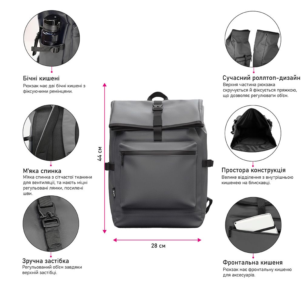 Рюкзак имеет просторную конструкцию: большое отделение с внутренним карманом на молнии, фронтальный карман для аксессуаров и два боковых кармана с фиксирующими ремешками. Верхняя часть рюкзака скручивается и фиксируется пряжкой, что позволяет регулировать объем. Рюкзак с логотипом на заказ станет прекрасным корпоративным подарком, который будет привлекать внимание к Вашему бренду.
