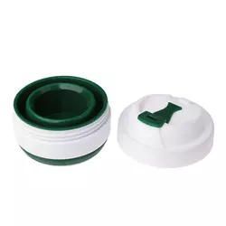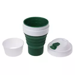 Складная силиконовая чашка с откидным клапаном и пластиковым держателем. Корпус изготовлен из пищевого силикона и имеет мерные деления на внутренней стороне. Съемный пластиковый ободок позволяет удобно держать чашку в руке. Резьбовое соединение крышки с чашкой для защиты от проливания. Силиконовый клапан на крышке обеспечивает герметичность и продолжительное сохранение температуры напитка.