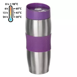 Термочашка с двойными стенками из нержавеющей стали. Надежная пластиковая крышка с кнопкой OPEN/CLOSE и отверстием для питья. Для удобства удержания в руке чашка имеет силиконовую вставку.