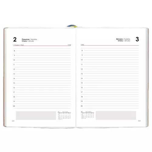 Обсяг: 320 сторінок. Одна сторінка - один день (СБ і НД на одній). Папір: щільність 70 г/м2. Мови: Українська, Англійська Організатор дня з 8.00 до 20.00. Перфорація кутиків. Закладка ляссе. Сторінки для нотаток.
