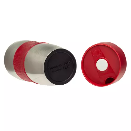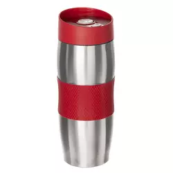 Термочашка з подвійними стінками з нержавіючої сталі. Надійна пластикова кришка з кнопкою OPEN/CLOSE та отвором для пиття. Для зручності утримання в руці чашка має силіконову вставку.