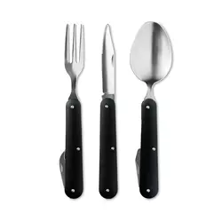 Оригінальний зручний набір складаних столових приборів виготовлений з комбінації нержавіючої сталі та алюмінію. Чудовий корпоративний подарунок для брендів, які підтримують активний спосіб життя. Такий набір - незамінна річ в подорожі, у відрядженні, в туристичному поході. До складу набору входять: ложка, виделка, ніж, штопор, відкривачка для пляшок, відкривачка для консервів.